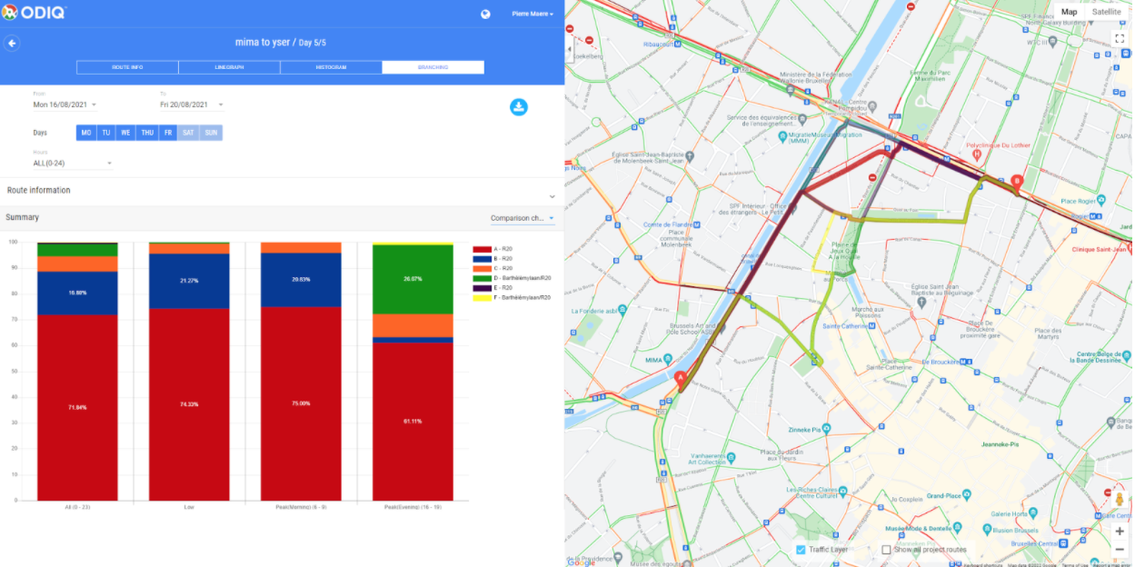 ODIQ's new branching tool allows you to see which routes are recommended for certain start and end points. Once you have selected these start and end points you can start monitoring and view the results in the dashboard. Furthermore, this data is also visualized through the use of graphs. This way it becomes clear which routes are the most recommended during off-peak and peak hours.